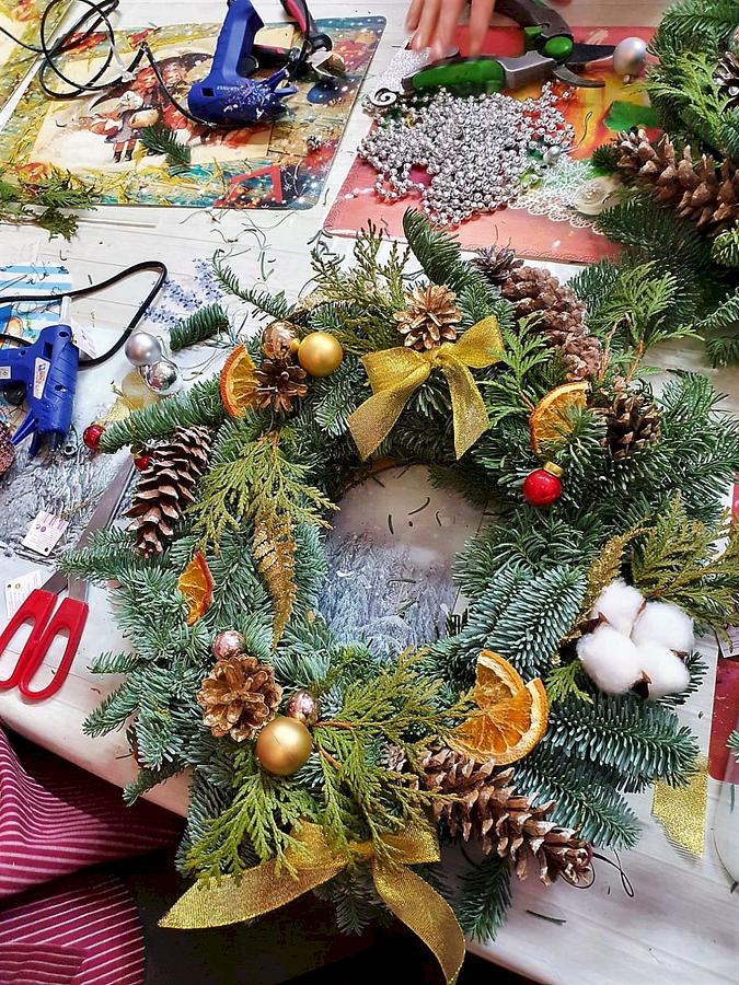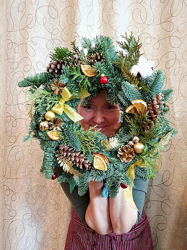 Участники встречи работали с живым нобилисом, сосновыми и кипарисовыми шишками, а также множеством декоративных элементов, сухими дольками лайма, апельсина и яблок. Шаг за шагом участники постигали искусство создания праздничных композиций, экспериментируя с цветом, подбирая форму. Под руководством опытного педагога все композиции получились яркими, праздничными и очень индивидуальными.