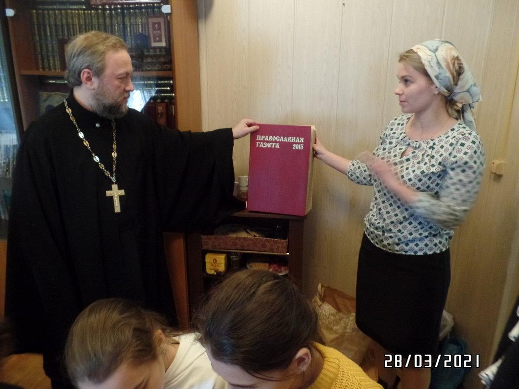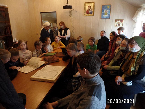 Директор Воскресной школы познакомила гостей с приходской библиотекой, включающей в себя полное собрание выпущенных на сегодняшний день томов Православной энциклопедии, трудов Святейшего Патриарха Московского и всея Руси Кирилла, разнообразную духовную литературу, интересные и редкие издания.