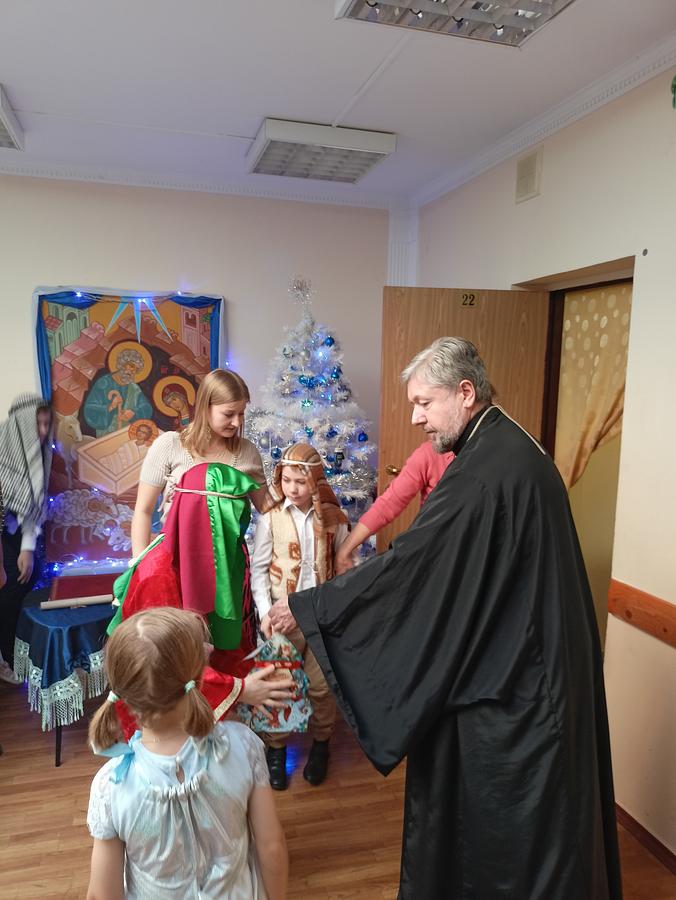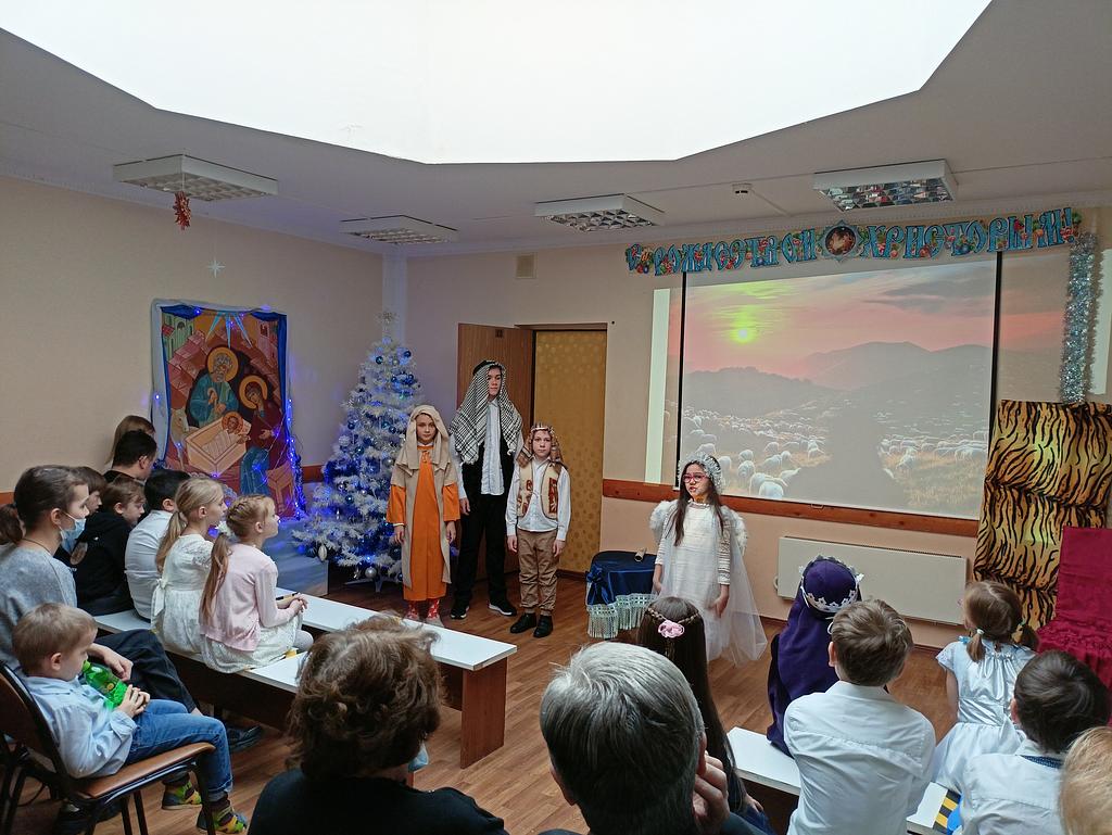 Учащиеся Воскресной школы подготовили инсценированный рассказ, в котором раскрыли духовный смысл праздника. В красочных костюмах волхвы шли за звездой, которая указывала на место рождения Христа, а пастухам представилась встреча с Ангелом, который возвестил им о рождении Господа. С благоговением и радостью все участники праздника славили новорожденного Христа.