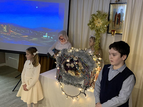 Центром действия стал Рождественский вертеп: скромная пещера, в которой родился Младенец Христос. Каждый участник спектакля озвучивал библейского персонажа из числа участников событий Рождества. Во время спектакля дети исполнили несколько Рождественских песнопений в фольклорном стиле и Рождественские колядки. ЕгорЧухлеб исполнил на фортепьянокомпозицию «Странники» из Рождественской кантаты Ариэля Рамиресао путешествии Девы Марии через пустыню и рождении Иисуса Христа. В конце дети исполнили тропарь праздника Рождества Христова.