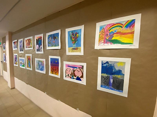 Стены актового зала были задрапированы специальной бумагой, на которой накануне были вывешены десятки рисунков детей. Уже не в первый раз в актовом зале организуется выставка художественных произведений, что стало доброй традицией.