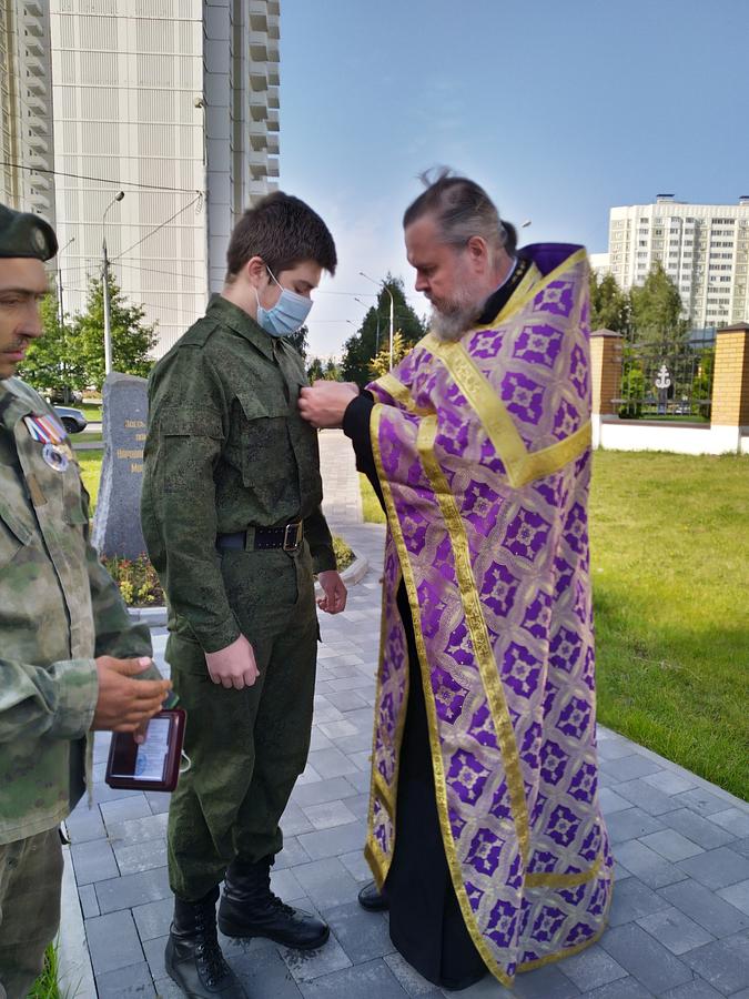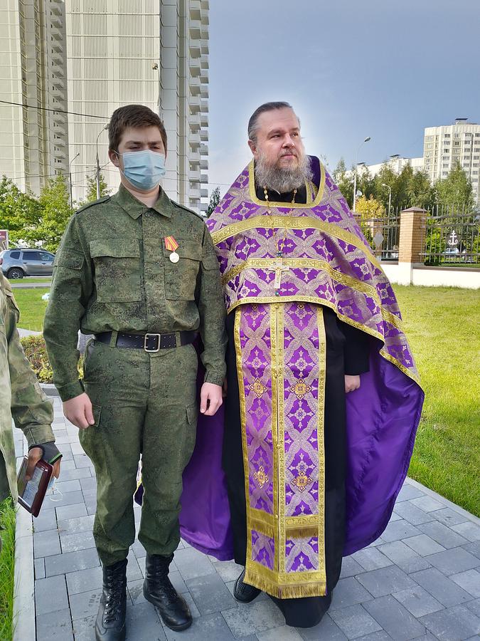 Ответственную миссию почетного караула с Андреевским флагом и флагом Российской Федерации возложили на учащихся Воскресной школы Симакова Арсения и Леонова Александра.