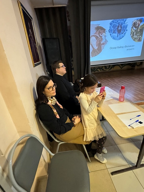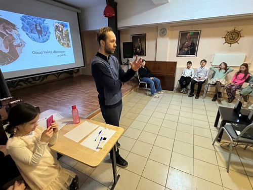 После этого учащиеся проследили как одна и та же идея, например, «ахиллесова пята», может появляться в разных формах в разные эпохи. Затем всем участникам раздали текст сказки О. Уайлда «Великан-эгоист», который прочитали вслух, а затем перешли к обсуждению. Преподаватель старался сделать так, чтобы дети могли сопоставить христианские смыслы Евангелия с героями книги.