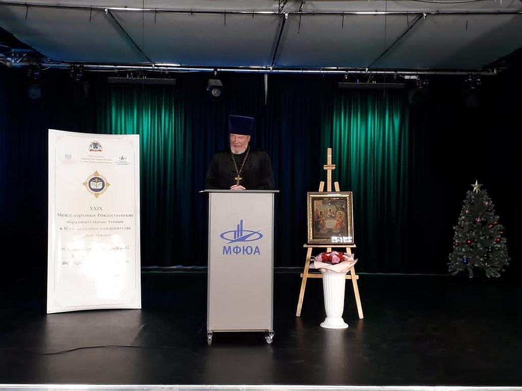 После молитвы, референт управляющего Юго-Западным викариатством по Религиозному образованыию иерей Евгений Марков обратился к присутствующим, зачитав приветственные слова Владыки Феофилакта, направленные всем гостям и участникам Рождественских чтений.