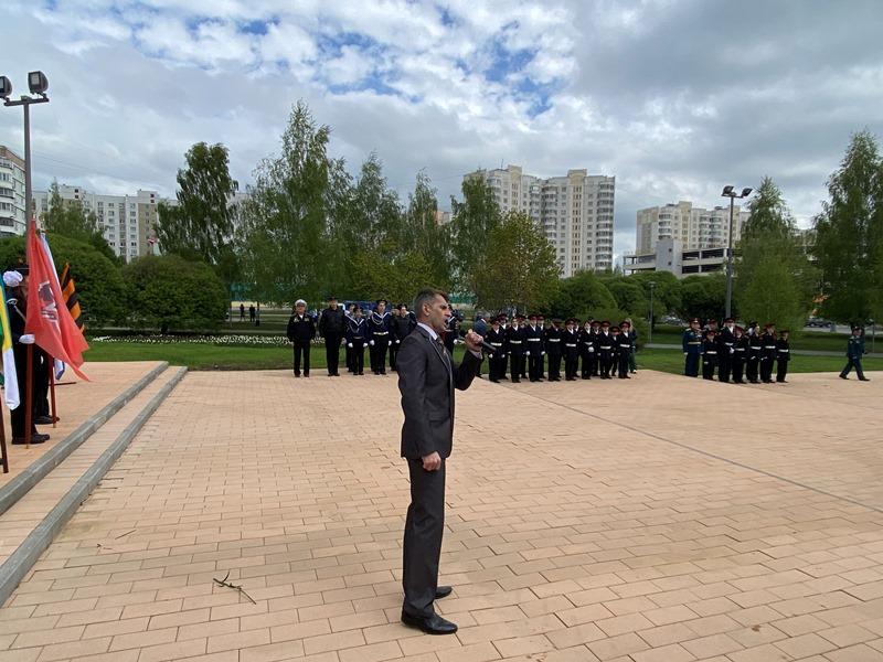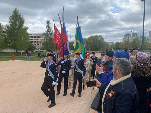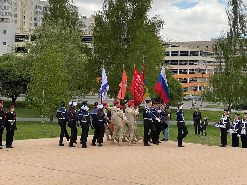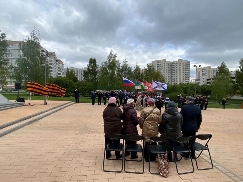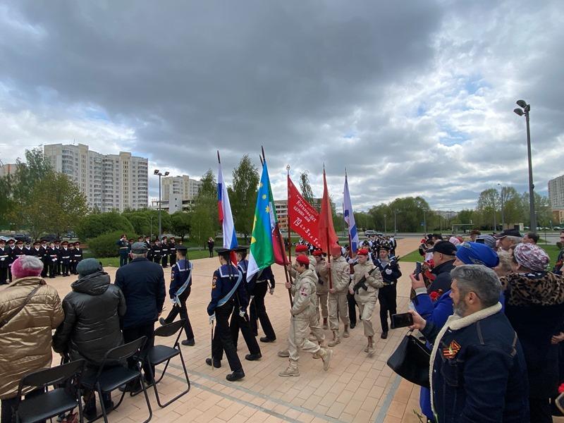 Открылась торжественная часть с внесения Государственного флага России, Знамени Победы, Флага города-героя Москвы, флага района Южное Бутово, флага Юнармии.