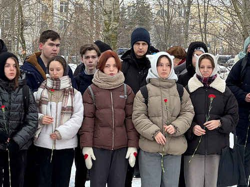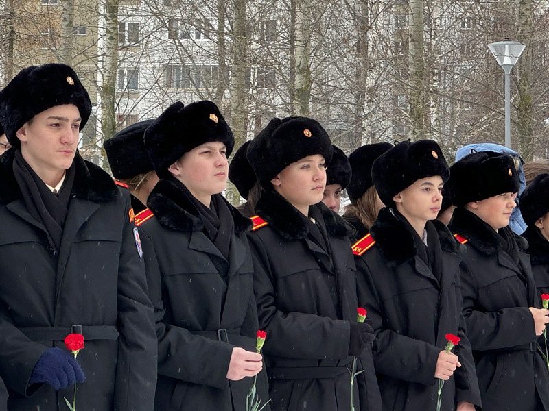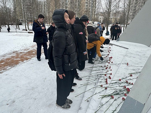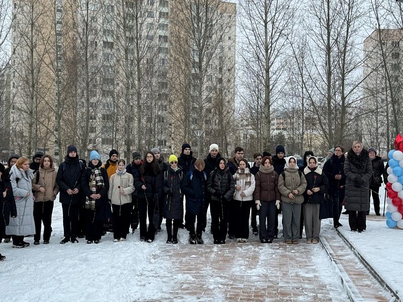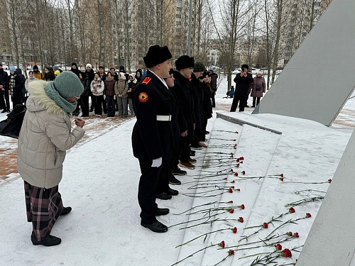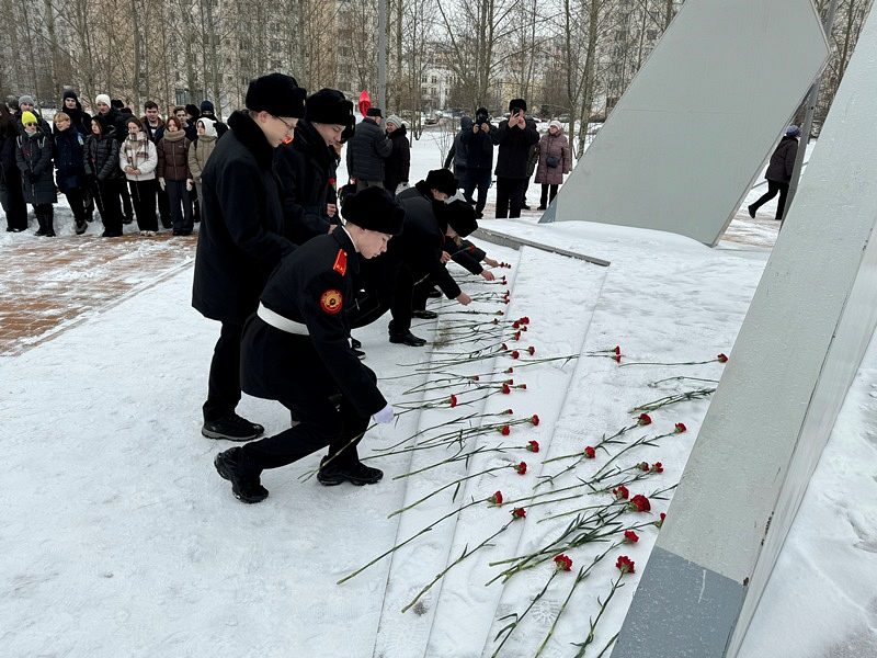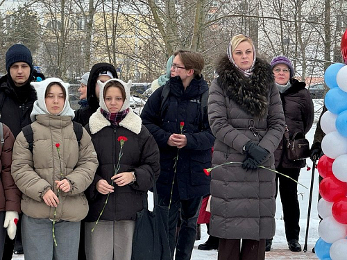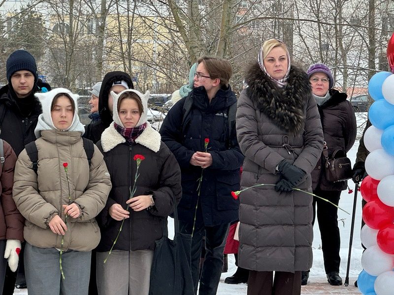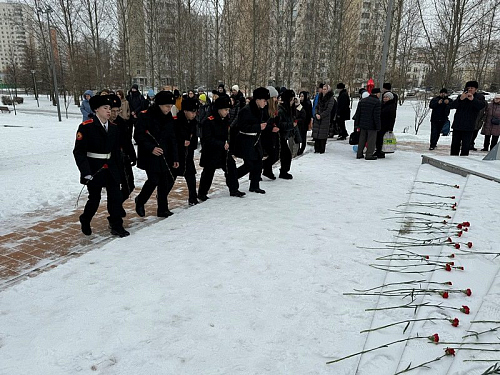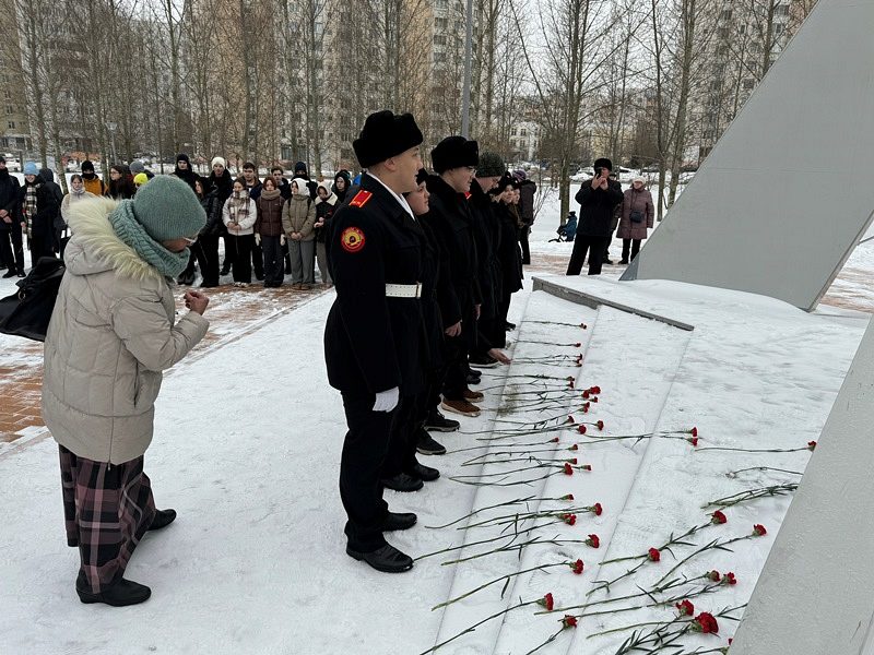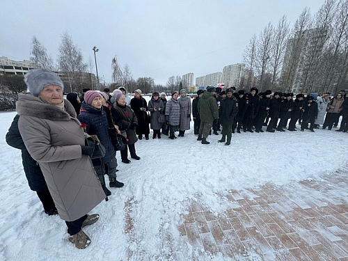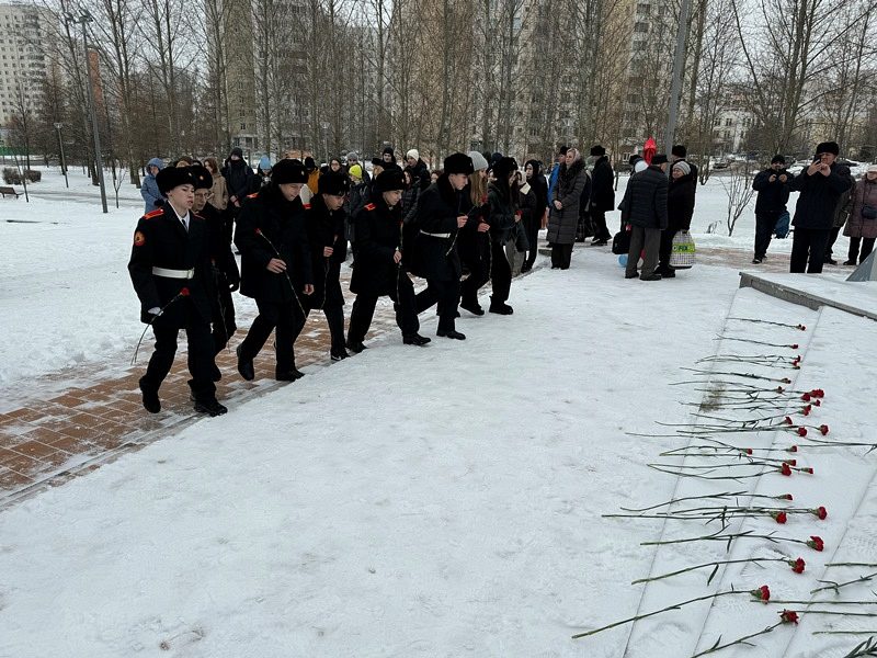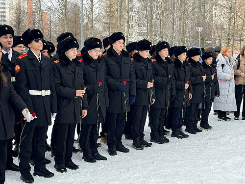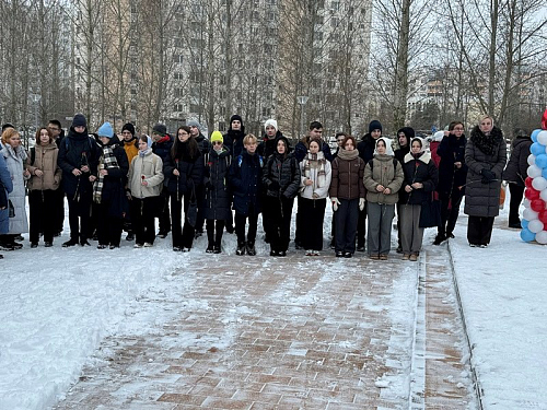 Около памятника выстроились кадеты и учащиеся нескольких школ района № 368,2009,1980,1981,1883,1492.