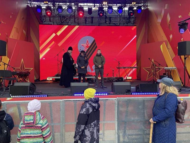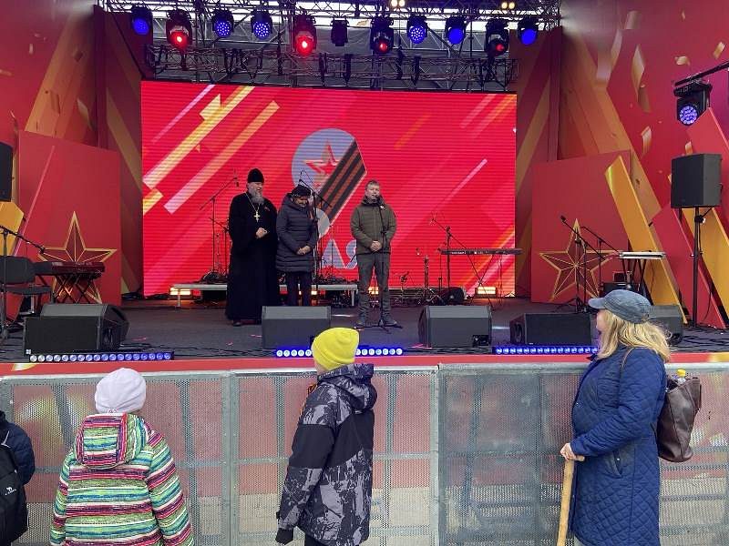 С размышлением о Дне Победы, призывом к духовной бодрости и любви к Родине, особенно молодежи, кадетам и юнармейцам, светлому настрою и пасхальной радости обратился ко всем игумен Дамиан. Завершил свое слово игумен Дамиан поздравлением всех присутствующих с Пасхой Христовой и традиционным пасхальным приветствием: Христос Воскресе!
