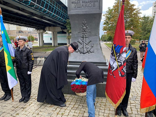 После официальной части Павел Викторович Голубцов и игумен Дамиан возложили корзину цветов к памятнику адмирала Ушакова. Далее цветы возложили ветераны и кадеты.