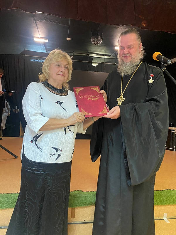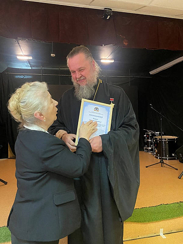 Также Валентина Григорьевна вручила настоятелю храма игумену Дамиану Благодарность Префекта ЮЗАО г. Москвы Олега Александровича Волкова за значительный вклад в развитие ветеранского движения, социальную защиту ветеранов и пенсионеров, активную работу по патриотическому воспитанию молодежи на территории Юго-Западного административного округа города Москвы и в связи с 30-летием со Дня образования Совета пенсионеров, ветеранов войны, труда, Вооруженных сил и правоохранительных органов Южного Бутова г. Москвы.
