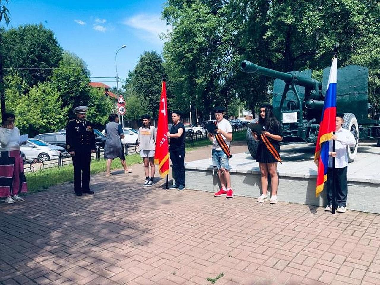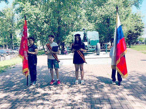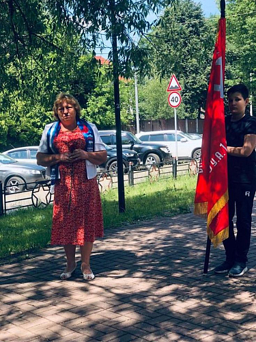 Ребята читали стихи о войне. После прозвучавших слов к памятнику погибшим в годы войны у школы были возложены цветы. В 12.15 была объявлена минута молчания. Кадеты школы стояли у памятника в почетном карауле со знаменами.