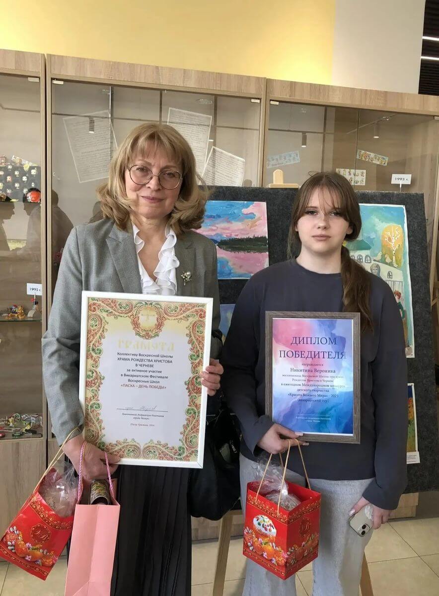 25 апреля 2026 года Воскресная школа храма Рождества Христова в Черневе приняла участие в Фестивале творчества воскресных школ Юго-западного викариатства "Пасха Христова". Он состоялся в многофункциональном культурно-досуговом центре "Атлант" (ул. Грина, 1Б). Учащиеся воскресных школ нашего округа подготовили яркие, запоминающиеся концертные номера: стихи, песни, танцевальные композиции. Нашу Воскресную школу представляла ученица старшего класса Варламова Варвара с танцем "Вариация Нунэ" из балета "Гаянэ" А. Хачатуряна, показав зрителям высочайшее мастерство и технику исполнения! На фестивале традиционно награждали победителей Международного детского конкурса "Красота Божьего мира". Ученица нашей школы, Никитина Вероника, была награждена грамотой и подарками за 3 место! С приветственным словом к собравшимся обратился референт Воскресных школ Юго-западного викариатства, настоятель храма иконы Божией Матери "Отрада и Утешение" на Каховке, иерей Александр Мелин. По окончанию фестиваля все артисты были приглашены на сцену для исполнения соборно песни "Вера наша, Вера славна..." (автор святитель Николай Сербский).