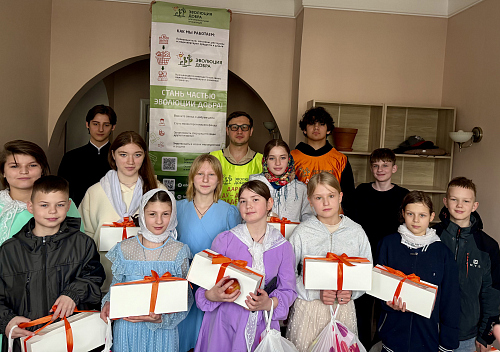 Во время обеда представитель благотворительного фонда «Эволюция добра» (г. Липецк) Михаил Георгиевич Пещеров и представитель Воскресной школы храма преподобной Евфросинии, великой княгини Московской, в Котловке вручили воспитанникам приютов и их сопровождающим пасхальные подарки.