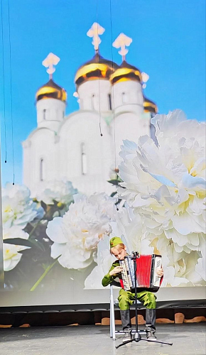 Приходской фольклорный ансамбль «Веретёнце» исполнил народные песни «Ой на горе то церковка» под аккомпанемент баяна и задорную «Заболела Дунина головка» в сопровождении балалайки. Юный музыкант Арсений Ломакин на баяне исполнил попурри «Звуки победы».
