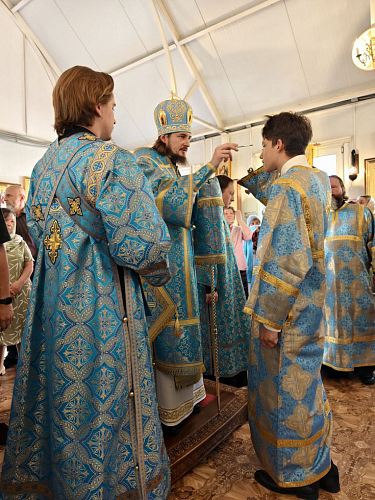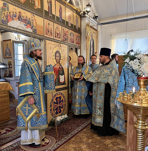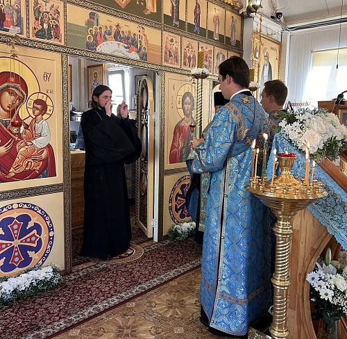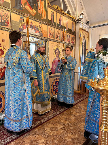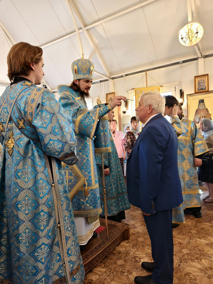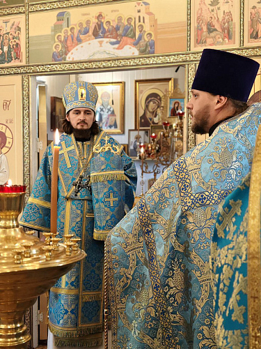 Его Преосвященству сослужили и. о. настоятеля храма Святителя Спиридона, епископа Тримифунтского, Чудотворца иерей Сергий Евтеев, диакон Константин Бабак.