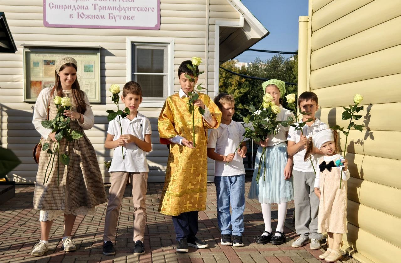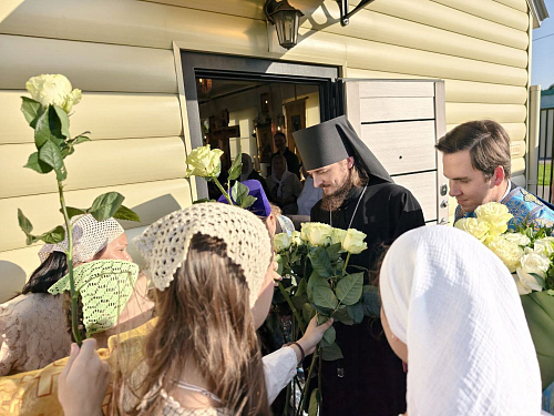 При входе в храм владыку встречали цветами учащиеся приходской воскресной школы.