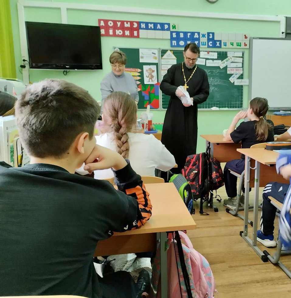 30 января 2025 года по благословению и.о. настоятеля храма Великомученицы Анастасии Узорешительницы в Тёплом Стане иерея Димитрия Борсука и по приглашению учителя начальных классов ГБОУ «Школы № 1101» Джуманиязовой О.К. иерей Стефан Даниленко и общественный методист Слободяник М.М. встретились с учениками 4 класса.