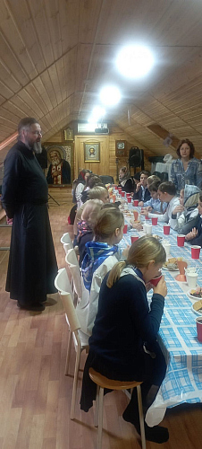 По окончании экскурсии все поднялись на второй этаж воскресной школы, где всех ждали чай и вкусные угощения. И тут наша встреча продолжилась в вопросах к отцу Николаю, дети узнавали много их интересующего, так, например, «Почему девочки в храм ходят в платочках?», «Для чего колокольный звон?» и т.д.