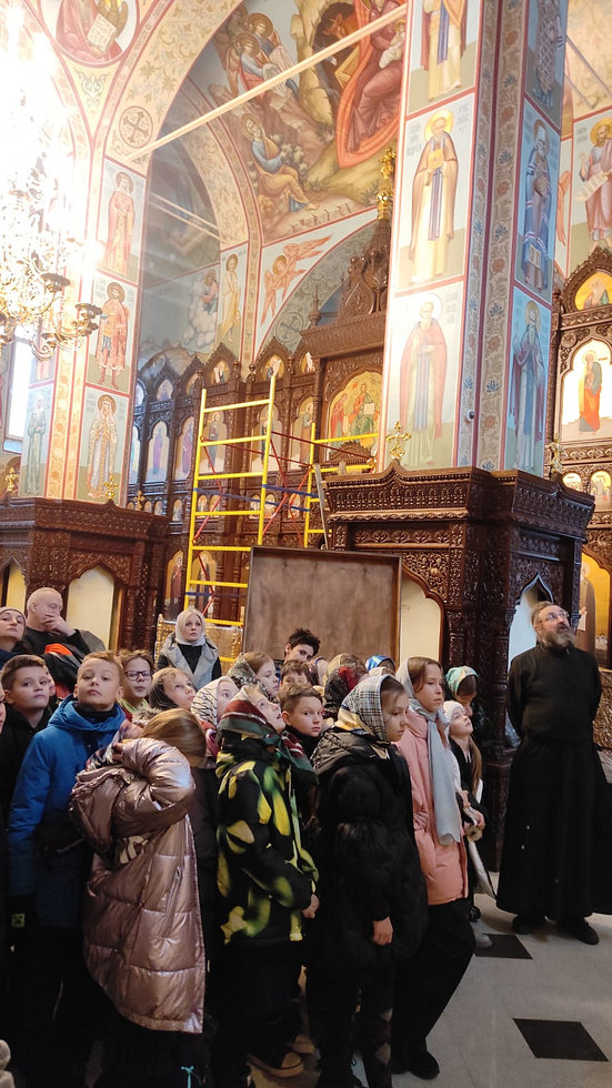 Для детей и родителей, а также педагогов школы сначала была проведена экскурсия по новому каменному храму, которую провел диакон храма Николай Сухарев и преподаватели Воскресной школы «Отрада» Елена Валерьевна и Юлия Валерьевна.