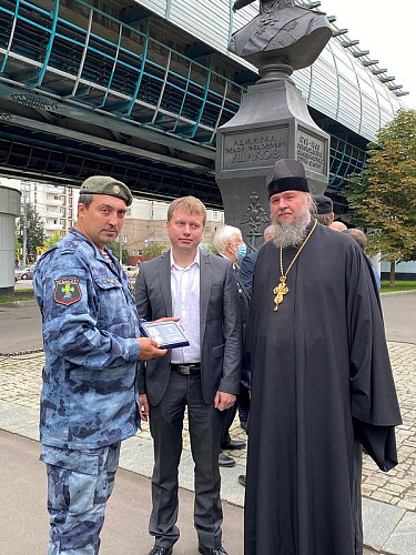 Руководитель Гражданско-Патриотического Клуба "КАСКАД" Ливенцев Владимир Сергеевич вручил игумену Дамиану памятный знак в честь пятилетия Клуба в связи с активным взаимодействием и сотрудничеством в деле воспитания молодежи.