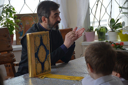 Затем беседу продолжил иерей Самуил Мнацаканов, он показал ребятам богослужебную книгу «Апостол», выносимую из алтаря на службах. Детям было рассказало несколько интересных исторических фактов, в частности, что Иван Федоров был диаконом и служил в Кремлевской церкви свт. Николая Гостунского, разобранной в 1817 г. Было подмечено, что «Апостол» Ивана Федорова не имел ни одной опечатки и удивлял своей типографской аккуратностью, что стало неким эталоном для всех последующих печатных изданий на Руси.