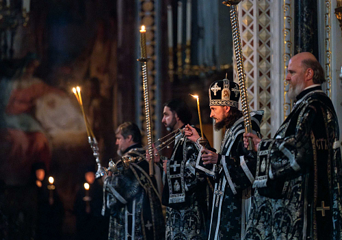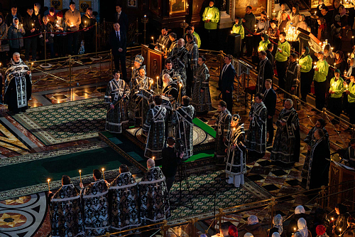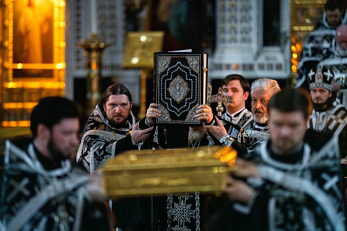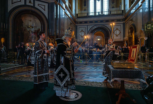 По окончании утрени Святейший Патриарх Кирилл, архиереи, духовенство и верующие поклонились Кресту, частице Ризы Господней и Гвоздю от Креста Господня.