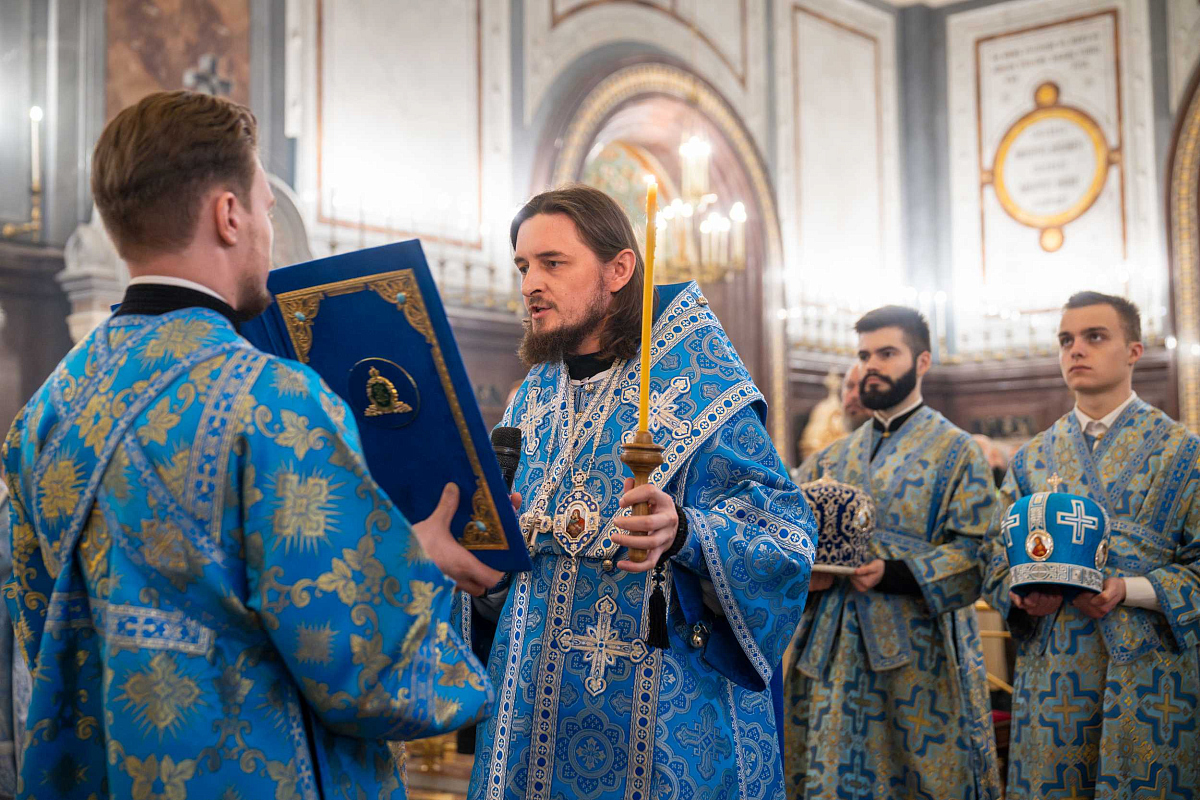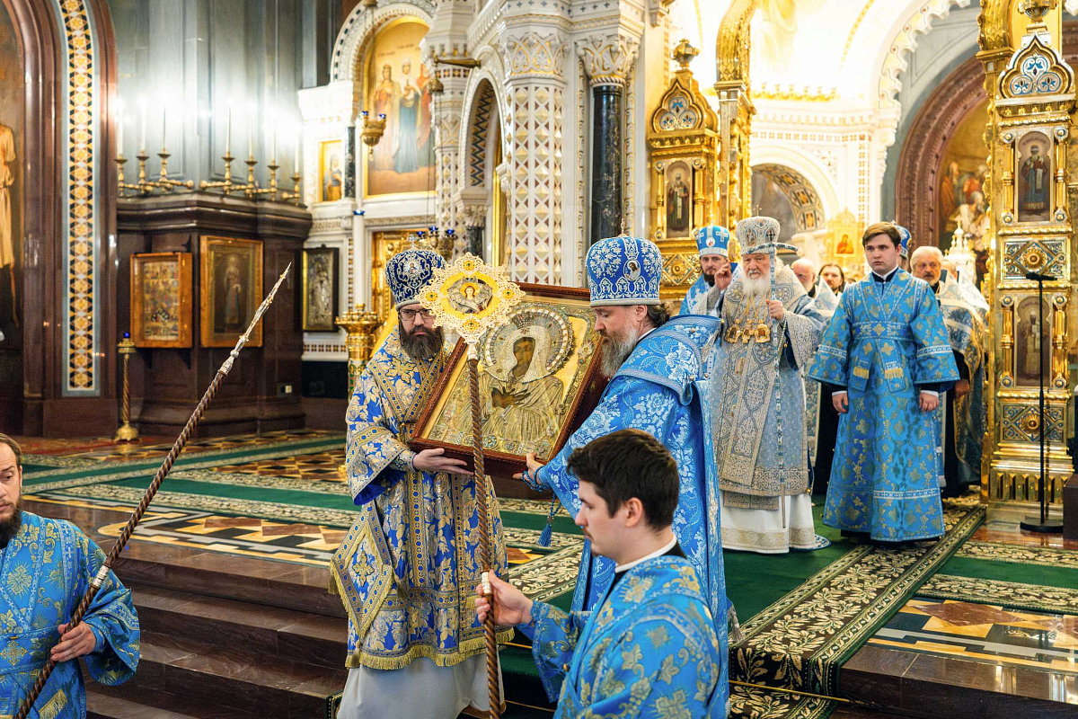 В начале Патриаршего богослужения Серафимо-Дивеевская икона Пресвятой Богородицы была вынесена из алтаря и установлена на аналое в центре Храма Христа Спасителя.