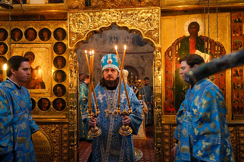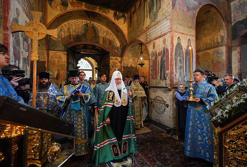 7 апреля 2026 года, в Великий Вторник, праздник Благовещения Пресвятой Богородицы, день преставления святителя Тихона, Патриарха Московского (1925), Святейший Патриарх Московский и всея Руси Кирилл совершил вечерню и Божественную литургию святителя Иоанна Златоуста в Благовещенском соборе Московского Кремля.