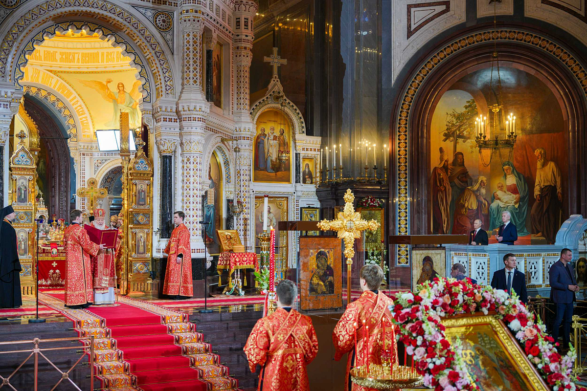 От всего православного народа, в том числе от этих тысяч людей, которые сегодня здесь присутствуют, я сердечно благодарю Вас за возвращение святынь в родной дом! Благословение Божие да пребывает с Вами, с Вашими родными, близкими, с Вашими коллегами, со всеми теми, кто вместе с Вами трудится сегодня во благо нашего Отечества! Храни Вас Господь!»