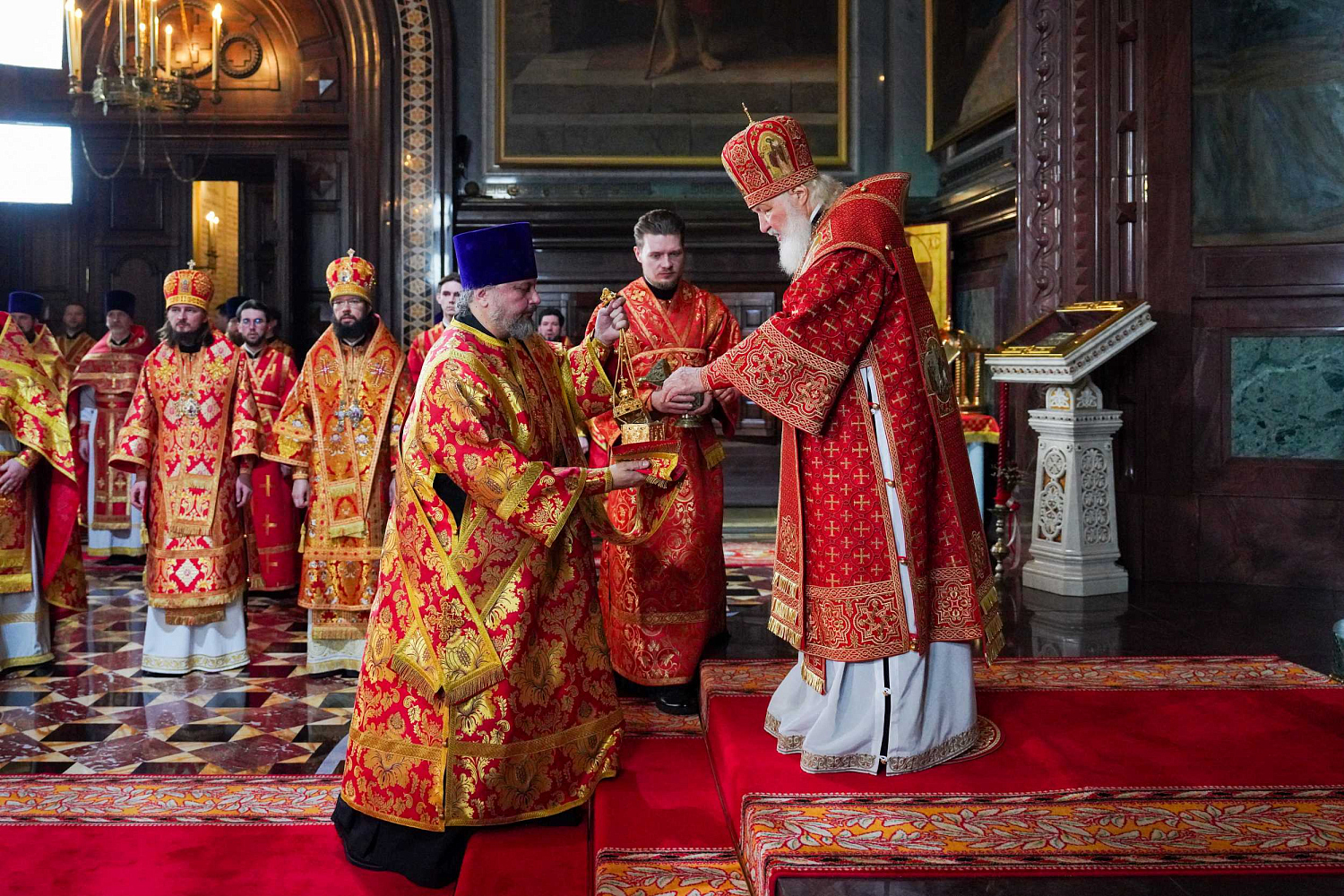 По традиции после пения пасхального канона в алтаре Святейший Патриарх Кирилл, архиереи и духовенство сменили белые облачения на красные.