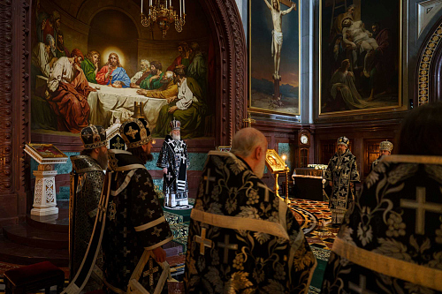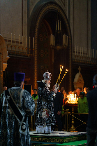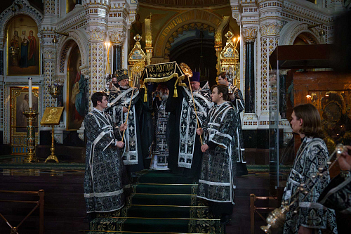 10 апреля 2026 года, в Великий Пяток — день, посвященный воспоминанию Святых спасительных Страстей Господа нашего Иисуса Христа, Святейший Патриарх Московский и всея Руси Кирилл совершил вечерню с выносом Плащаницы Спасителя в кафедральном соборном Храме Христа Спасителя в Москве.
