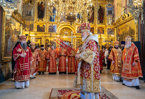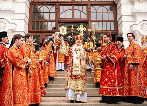 Затем Предстоятель совершил водосвятный молебен, после чего возглавил крестный ход вокруг Успенского собора.