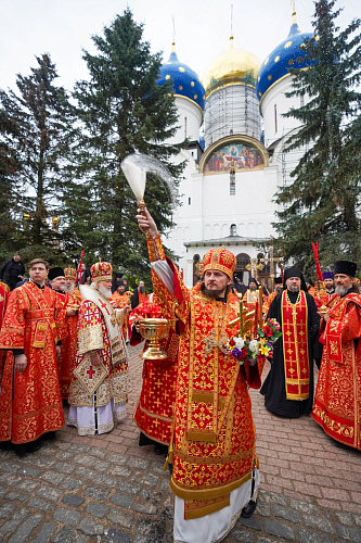 По окончании Литургии епископ Сергиево-Посадский и Дмитровский Кирилл от лица братии обители приветствовал Предстоятеля Русской Церкви и преподнес Его Святейшеству пасхальное яйцо.