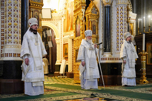Его Святейшеству сослужили: митрополит Воскресенский Григорий, управляющий делами Московской Патриархии, первый викарий Патриарха Московского и всея Руси по г. Москве; епископ Раменский Алексий, личный секретарь Святейшего Патриарха Кирилла; протоиерей Михаил Рязанцев, ключарь Храма Христа Спасителя; духовенство г. Москвы.