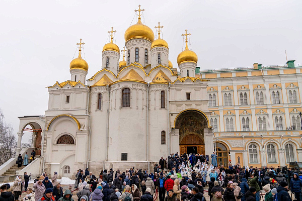 В праздник Благовещения Пресвятой Богородицы Святейший Патриарх Кирилл совершил Божественную литургию в Благовещенском соборе Московского Кремля